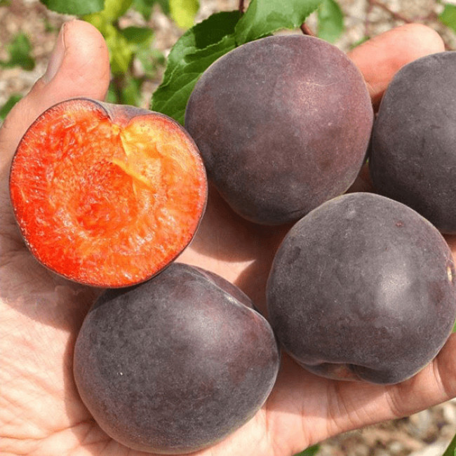 Гібрид абрикоса й аличі/сливи, плоди темно-фіолетові, майже чорні, масою близько 50–80 г (іноді до 150 г) М’якоть соковита, червоно-оранжева або винного кольору; кисло-солодкий смак із легкою терпкістю, ароматний