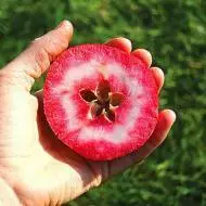 Яблука середньо-великі, округлої форми зі злегка витягнутою вершиною, вагою 200-210 г. Шкірка гладка, яскраво-червона з дрібними білими крапками, м'якоть червона, дрібнозерниста, хрумка та соковита, дуже солодка з сильним фруктово-ягідним ароматом, що проявляється на 3-4 тижні зберігання.